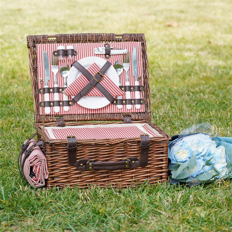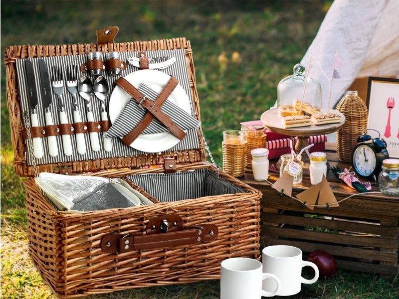 This luxurious willow picnic hamper comes complete with two red wine plastic glasses, two bottle opener, two stainless steel spoons,forks,knives,salt and pepper shakers, so that all you need to provide are the food and drinks! Spacious enough for a substantial feast, there's even a zipped cool compartment so that you can keep tasty treats at just the right temperature.